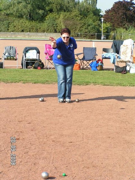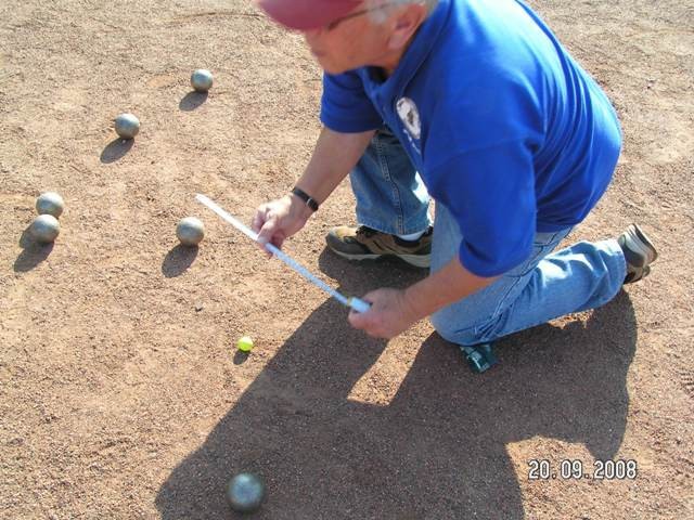 Entgegen der sonstigen Gepflogenheit, in Zweier-Teams gegeneinander anzutreten, spielt bei der Meisterschaft jeder gegen jeden (sog. Tête-à-Tête). Und so flogen die Stahlkugeln zur Zielkugel, dem so genannten Schweinchen, begleitet von Jubel (wenn sie sich ganz nah an die das Schweinchen legten) oder von enttäuschtem Aufschrei (wenn es nicht so richtig klappte). Zäh wurde um jeden Punkt gerungen – oft mit Hilfe des Zentimetermaßes und millimetergenauem Messen. Dass bei allem Ehrgeiz die Geselligkeit nicht zu kurz kam, versteht sich von selbst. So wurde bei Rotwein, Baquette und Pizza gelacht, geschwätzt (und natürlich das Spiel der Konkurrenten beobachtet.