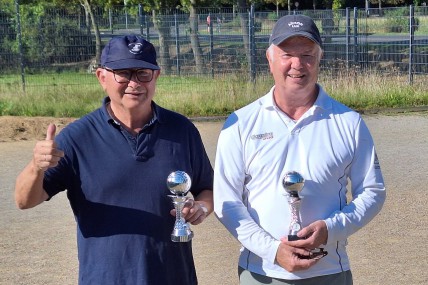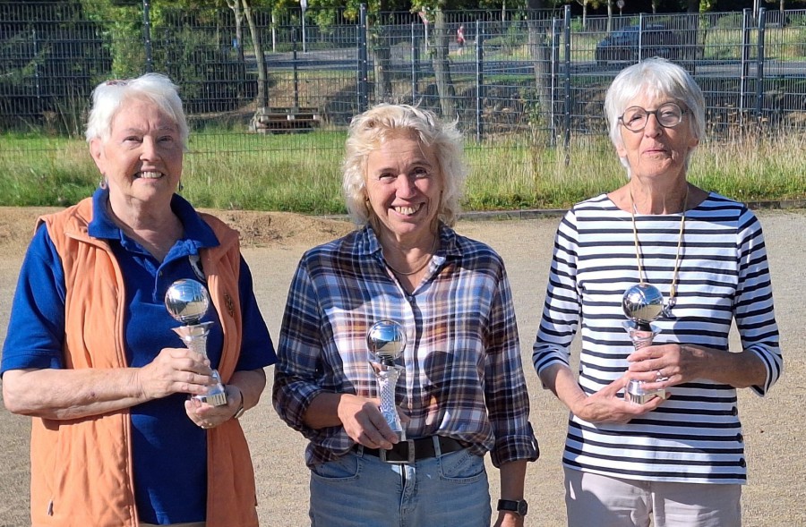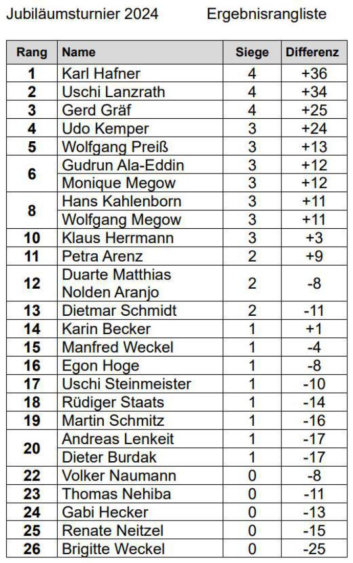 Dann konnten die Siegerinnen und Sieger ihre Jubiläumspokale in Empfang nehmen. Bei den Frauen hatten Gudrun und Monique die gleiche Anzahl von Differenzpunkten und spielten daher ein kurzes